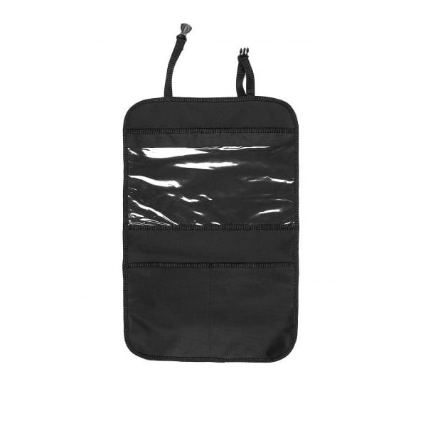 Органайзер сшит из прочного и износостойкого материала. Крепления: резинка для фиксации органайзера в нижней части и крепление с защелками в верхней. Для хранения вещей предусмотрен 2 кармана и 1 прозрачный карман, в нем можно разместить планшет или телефон. Размер - 40*60 см.