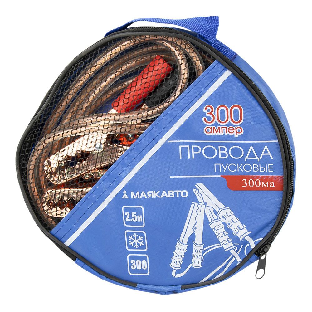 Провода прикуривателя «МаякАвто» с параметрами 300А и длиной 2,5 метра предназначены для подзарядки неработающего аккумулятора автомобиля от источника питания и подачи стартового тока на клеммы разряженного аккумулятора.
