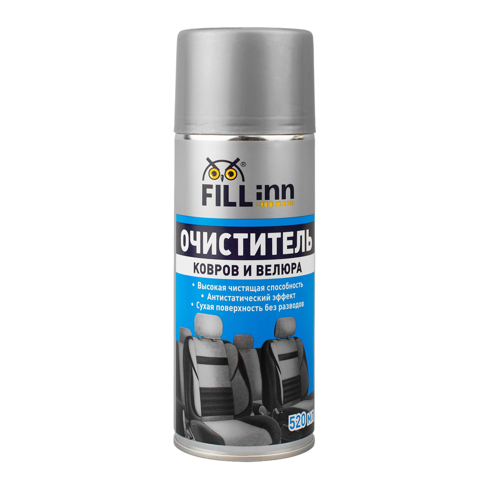 Очиститель Fillinn ковров и велюра 520 мл. Очиститель ковров и велюра FILL INN FL013 эффективно справляется с пятнами от масел, жира, чернил, губной помады и другими трудновыводимыми пятнами. Пенный слой, который создает средство, удерживается на поверхности, не стекает и не впитывается, поэтому позволяет без труда очистить обивку сидений и дверей, потолок и ковровые покрытия. Восстанавливает цвет ткани и придает ему насыщенность, защищая поверхности от выгорания на солнце. Обладает антистатическим эффектом, предотвращает скопление грязи и пыли. Устраняет неприятные запахи и оставляет в салоне машины приятный аромат.