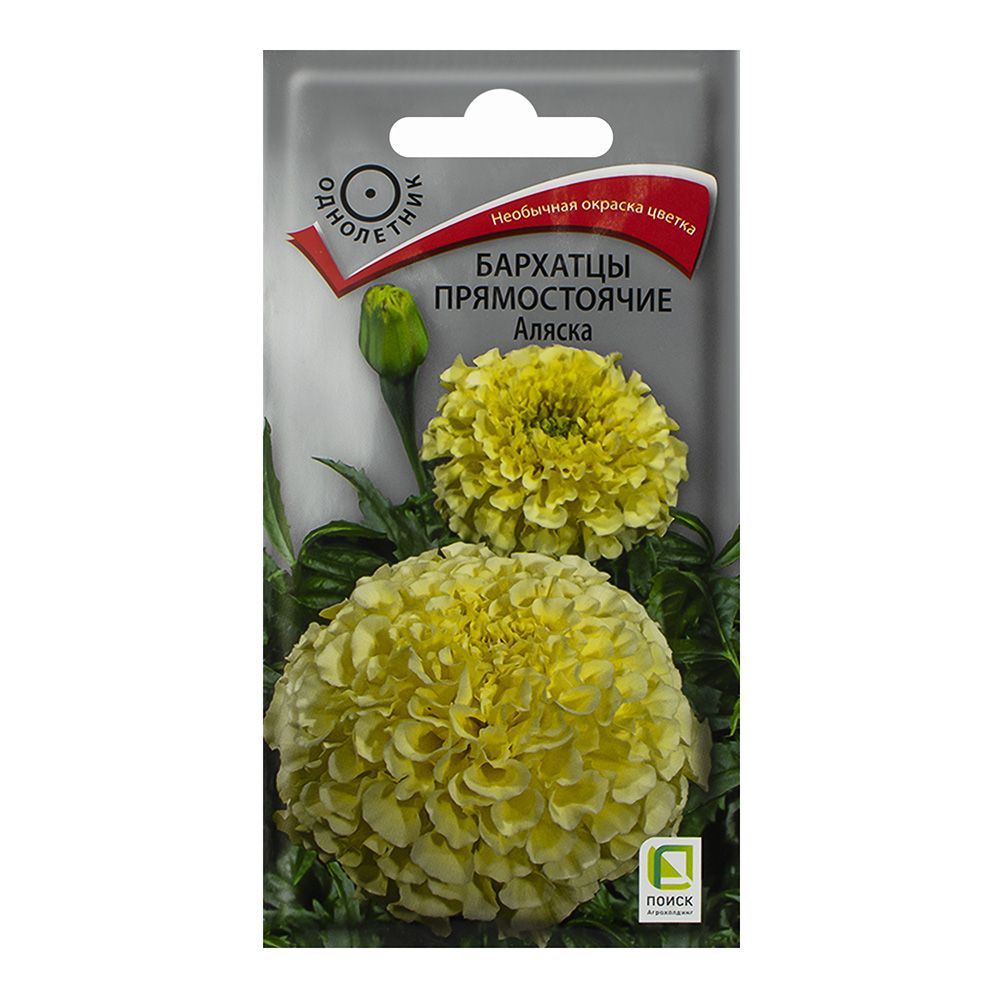 Бархатцы Аляска – это крупные махровые цветы чисто-белого оттенка. Растение высотой до 50 см идеально подходит для клумб и срезки. Цветет с июня до заморозков, радуя своей утонченностью. Этот сорт отличается высокой устойчивостью к неблагоприятным условиям, что делает его отличным выбором для садоводов.
