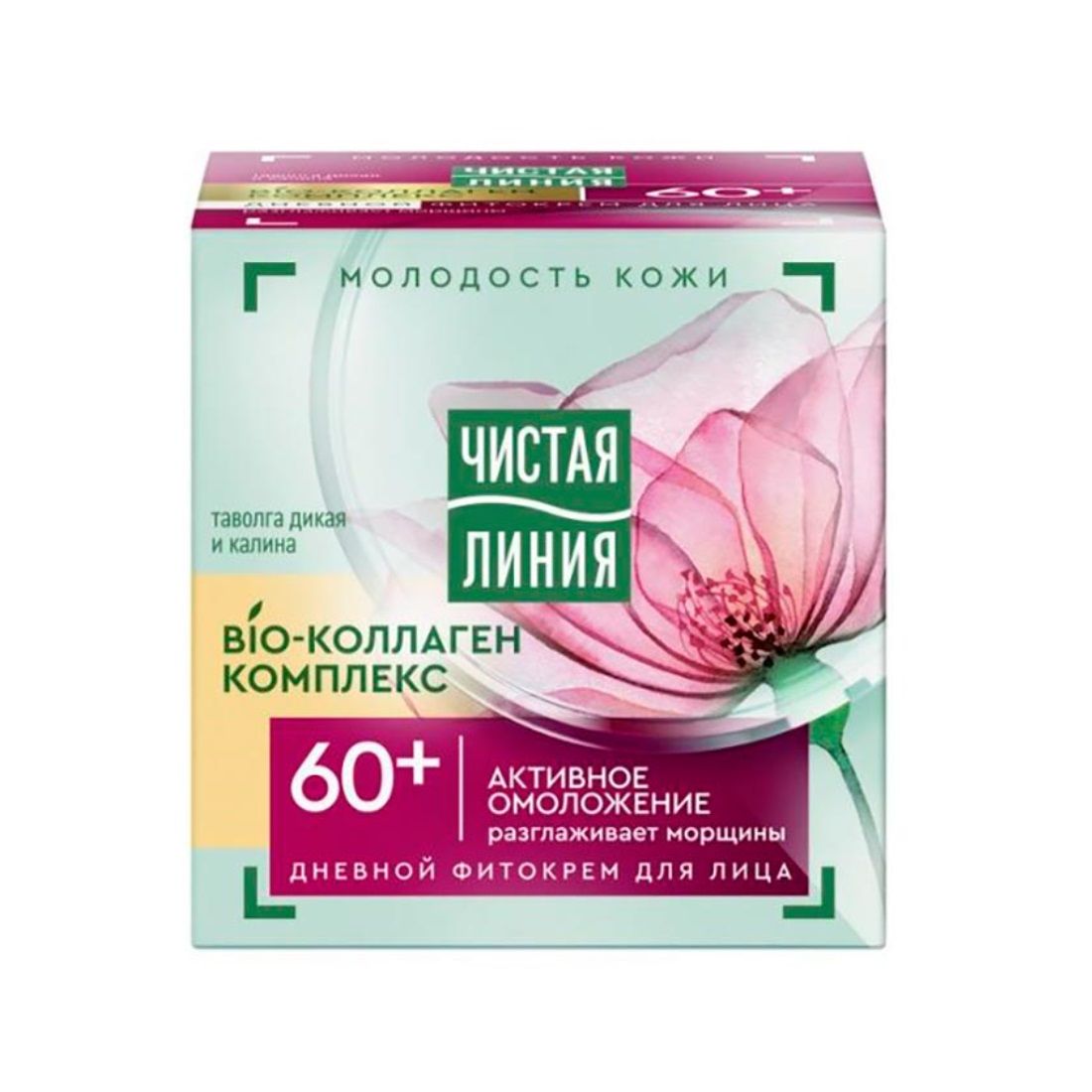 Крем для лица Чистая Линия дневной от 60 лет таволга и калина бережно заботится о зрелой коже. Эффективно сокращает морщины, освежает цвет лица, насыщает кожу энергией и здоровьем. Активные натуральные компоненты, входящие в состав комплекса Фитоколлаген, разглаживают кожу и делают ее более упругой.