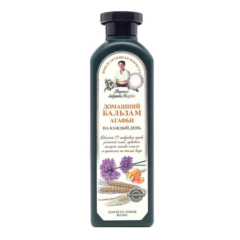 Бальзам для волос Рецепты бабушки Агафьи Домашний для всех типов волос 350 мл улучшает структуру волос, не утяжеляя их и облегчая расчесывание. Пшеничная вода, входящая в состав бальзама, придает волосам естественный объем, а бережно собранные травы укрепляют их от корней до самых кончиков.