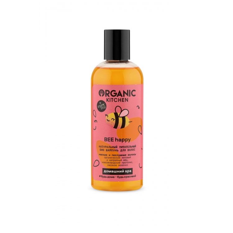 Шампунь для волос Натуральный питательный БИО BEE happy Organic Kitchen Домашний SPA 270 мл восхитительный медовый BEE HAPPY Honey Shampoo для потрясающей мягкости Ваших волос. Он превосходно очищает, помогает восстановить ослабленные и ломкие локоны благодаря питательным и смягчающим компонентам. Волосы жужжат от удовольствия!Органический липовый и кипрейный мед питают пряди по всей длине, насыщая их силой витаминов и микроэлементами. Новозеландский прополис обладает антиоксидантным действием, благодаря чему волосы под надежной защитой. Овсяное молочко делает их послушными, мягкими и ослепительно блестящими.