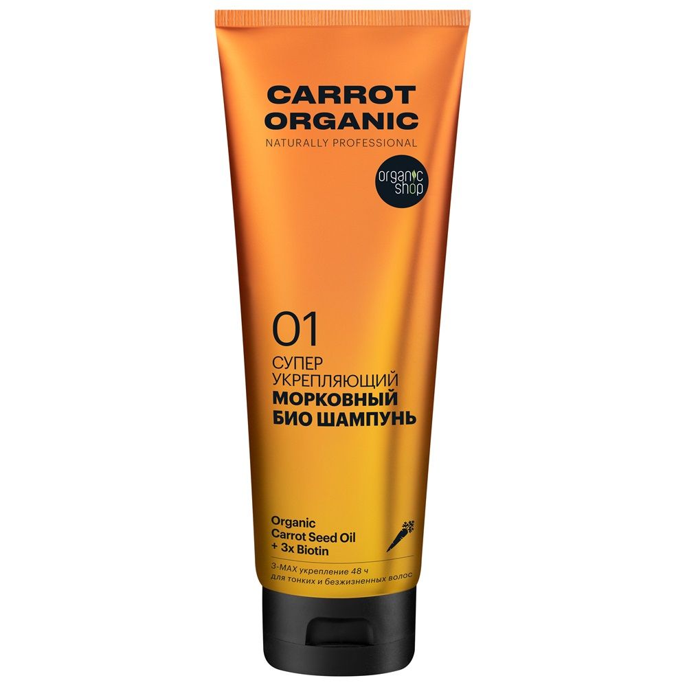 Шампунь для волос Organic naturally prof Carrot Супер укрепляющий 250 мл питает кожу головы и укрепляет волосяные луковицы. Органическое масло семян моркови питает кожу головы и укрепляет волосяные луковицы. 3D-биотин делает волосы сильными и крепкими изнутри, препятствуя выпадению волос. Био масло облепихи насыщает волосы витаминами и микроэлементами, восстанавливает их структуру. Конский кератин защищает волосы, придает упругость и блеск.