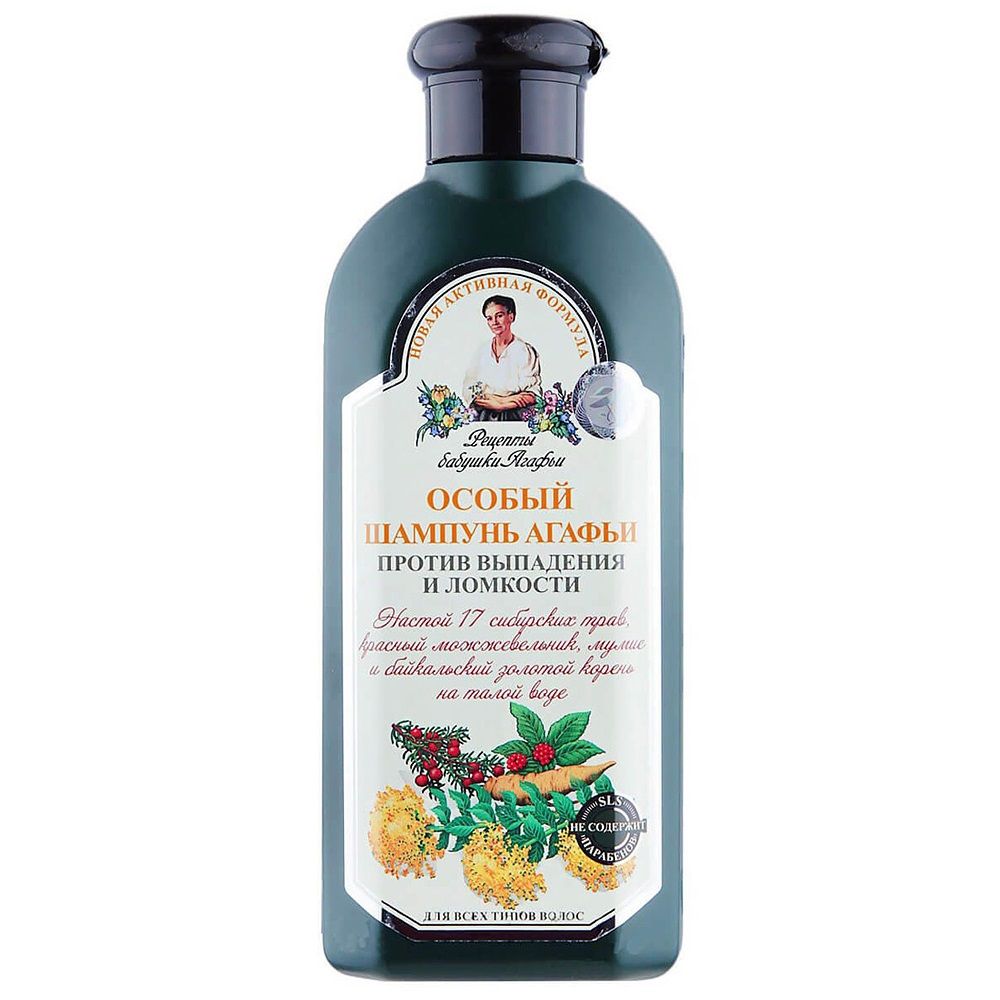Шампунь для волос Рецепты бабушки Агафьи Особый укрепляющий 350 мл против выпадения и ломкости создан на настое 17 сибирских трав, красного можжевельника и байкальского золотого корня на талой воде, с добавлением мумие.