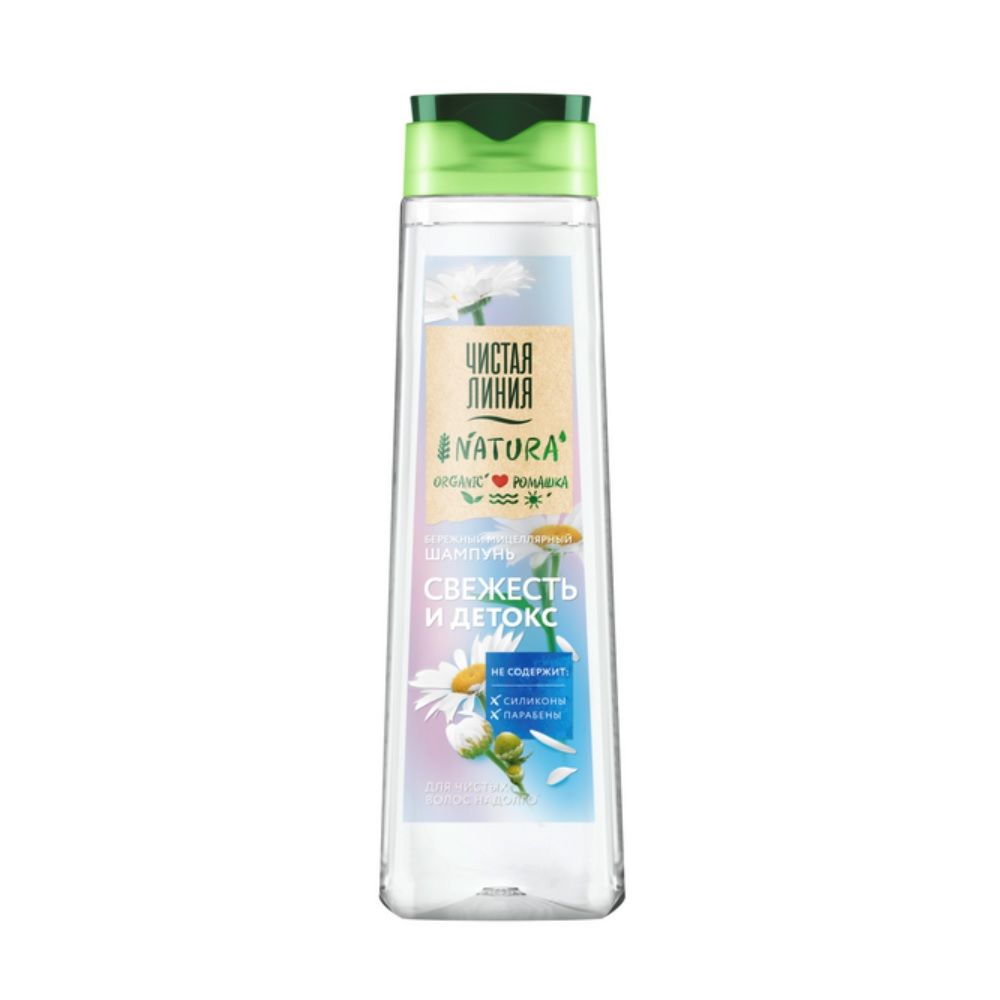 Шампунь для волос Свежесть и Детокс Чистая линия 400 мл не содержит силиконов и парабенов. Мицеллярная формула шампуней бережно очищает кожу головы и волосы от загрязнений, а органические компоненты особо эффективны для восстановления, увлажнения и питания волос. Биологически активные вещества ромашки обладают антиоксидантными свойствами, бережно ухаживают за кожей головы, смягчают волосы и придают им здоровый блеск.