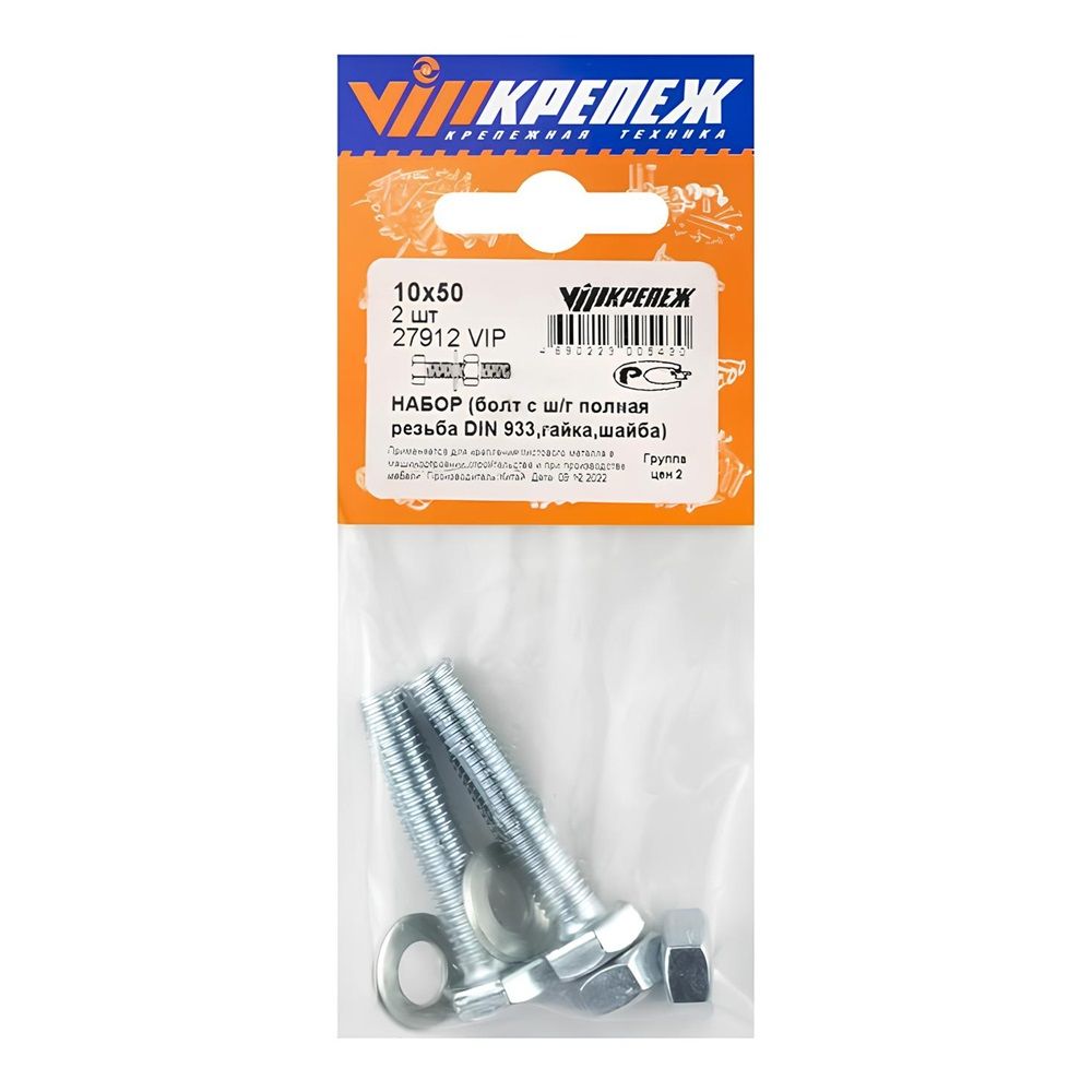 Болт DIN 933 М10х50 мм с шайбой и гайкой 2 шт