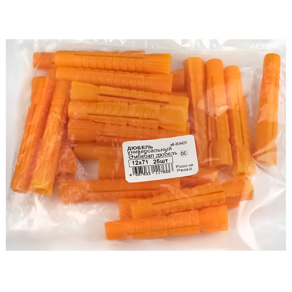 Универсальный дюбель 12х71 мм — прочный и надёжный крепёж для монтажа в бетон, кирпич, пеноблок, гипсокартон. За счёт расширяющейся формы обеспечивает плотную посадку и устойчивость к вырыву. Используется с шурупами диаметром до 8 мм. Идеален для тяжёлых конструкций. Упаковка — 25 шт. Для серьёзных креплений — универсальное решение!