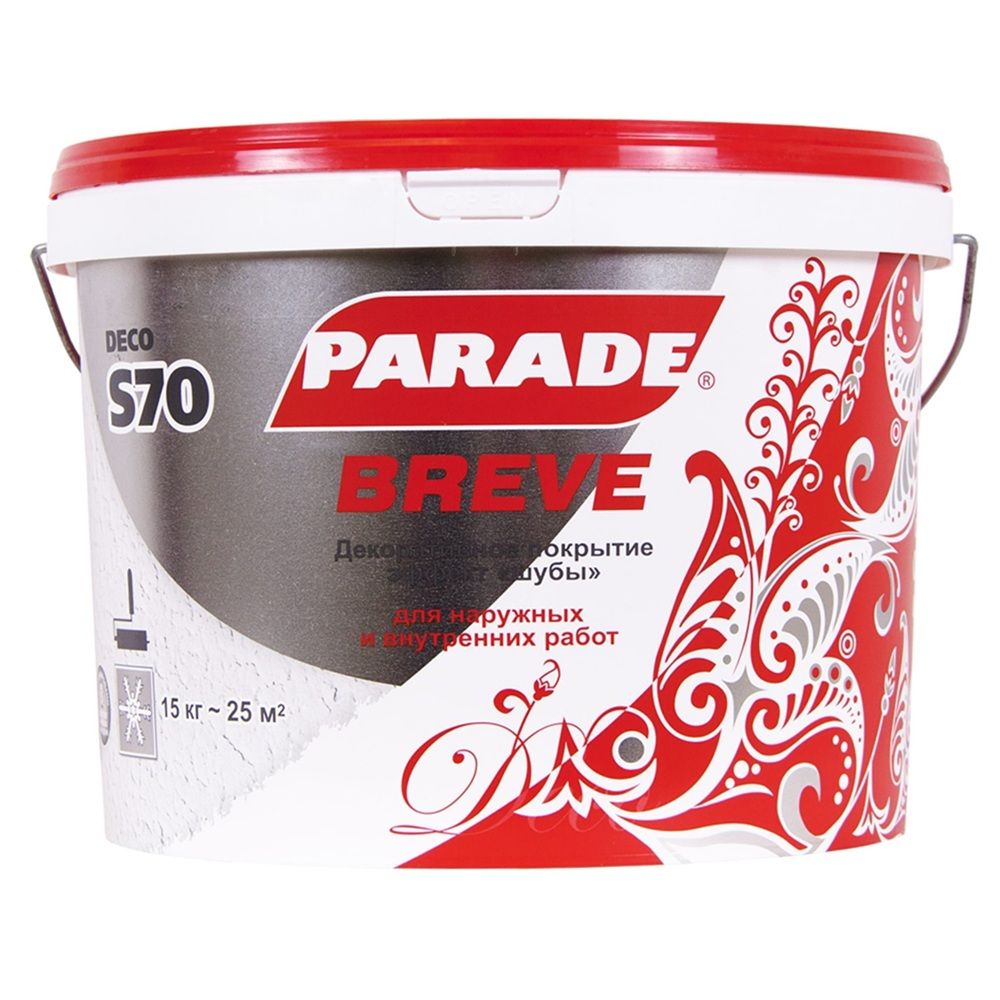 Parade Deco Breve S70 — это декоративное структурное покрытие с эффектом классической шубы, предназначенное для внутренних и наружных работ. Белая база позволяет как оставить покрытие в естественном виде, так и легко заколеровать его в нужный оттенок. Объём 15 кг рассчитан на большие площади, делает состав идеальным решением для отделки фасадов, коридоров, лестничных площадок, хозяйственных и коммерческих помещений. Покрытие скрывает мелкие неровности и дефекты основания, наносится валиком или механизированным способом. После высыхания образует прочную шероховатую поверхность, устойчивую к влаге, механическому истиранию, УФ-излучению и температурным перепадам. Отличается паропроницаемостью и долговечностью. Идеально подходит как для самостоятельного использования, так и как основа под лессирующие декоративные лаки и краски.