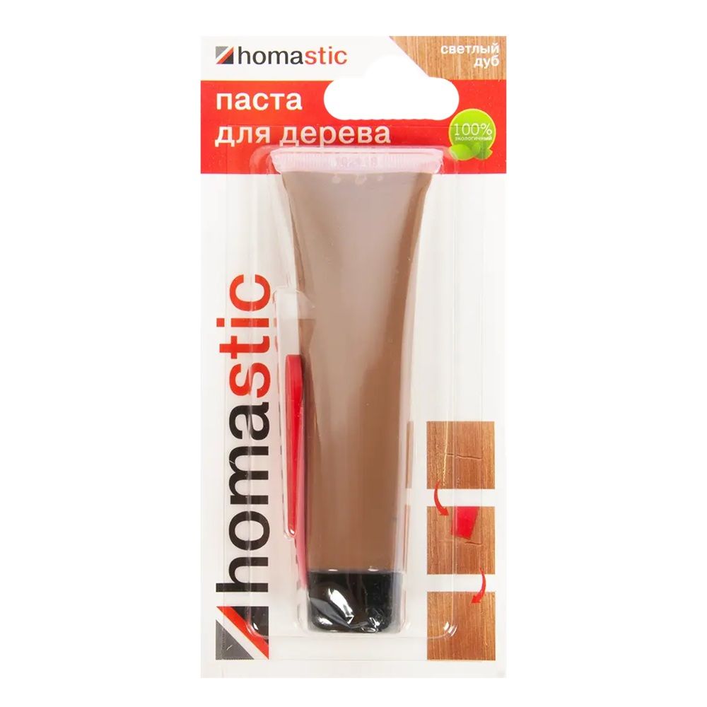 Паста Homastic обладает нежным оттенком светлого дуба, обеспечивая незаметное и естественное восстановление. Она легко наносится, заполняя повреждения и выравнивая поверхность. После высыхания и полировки паста создает прочное и долговечное покрытие, устойчивое к истиранию и влаге.