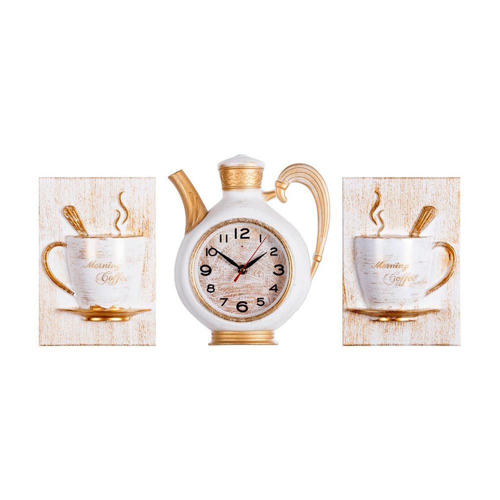 Часы настенные 2622+2-002 (5) чайник 26,5х24см+2 чашки, корпус белый с золотом "Классика"
