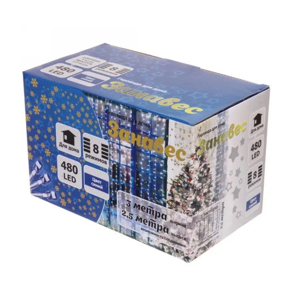 Гирлянда для дома Занавес 3х2,5 м 480 ламп LED 8 реж, прозр. пров, IP20, синий, соединение