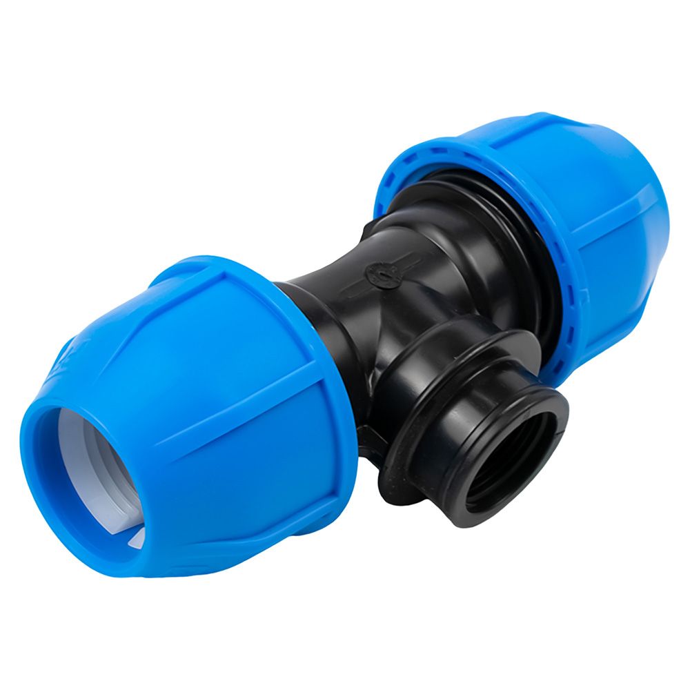 Переходной тройник ПЭ диаметром 32х32 мм с внутренней резьбой 3/4", предназначен для соединения трубопроводов.