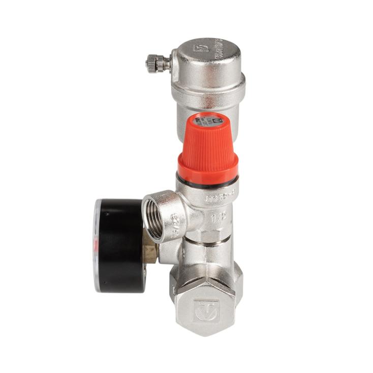 Группа безопасности котла Valtec VT.460.0.0 - это комплектная группа безопасности для оснащения котлов и бойлеров систем автономного отопления, ГВС. Применяется в установках с тепловой мощностью до 44 кВт (определяется штатным предохранительным клапаном), номинальным давлением не выше 10 бар, рабочей температурой не более 120 °С. Допустимая рабочая среда – пар, вода, незамерзающий теплоноситель (максимальное содержание гликолей – 50 %). Комплектация изделия: предохранительный клапан (настройка – фиксированная, 3 бара), автоматический воздухоотводчик, манометр, латунный никелированный корпус. Предусмотрен резьбовой патрубок для подключения расширительного бака (диаметр – 3/4”).