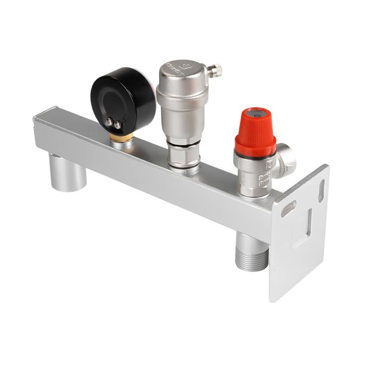 Группа безопасности расширительного бака Valtec VT.495.0.0 с диапазоном шкалы манометра 0-10 бар, представляет собой смонтированные на полой консоли из оцинкованной стали предохранительный клапан с фиксированной настойкой, автоматический воздухоотводчик, манометр. Консоль оборудована резьбовыми патрубками – присоединительным и для мембранного бака, фланцем настенного крепления. Непосредственно к группе допускается подвешивать «мембранник» объемом до 50 л.
