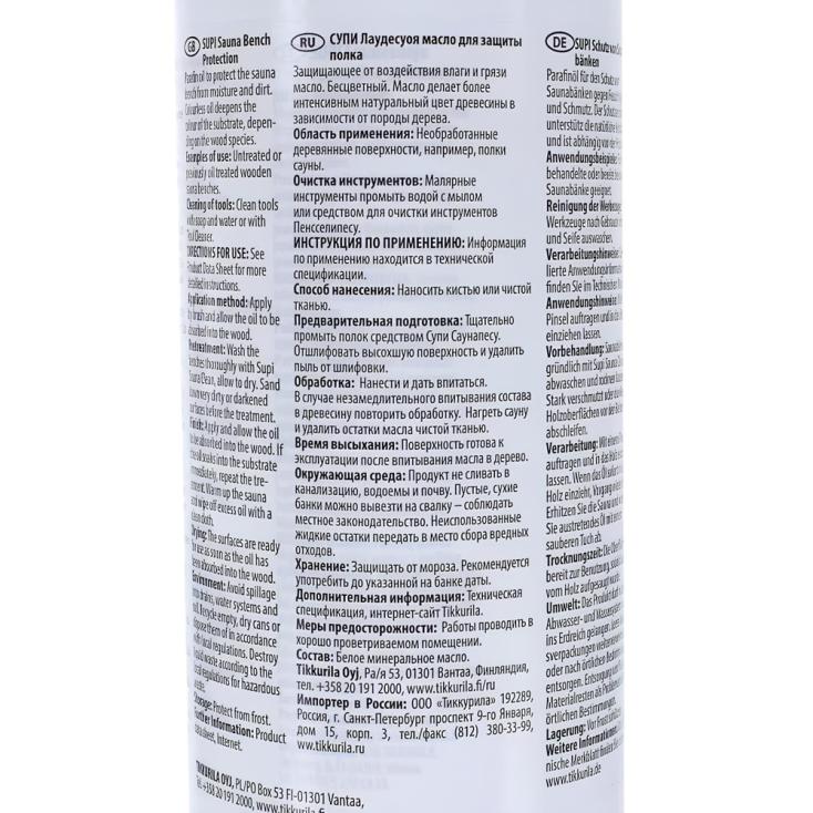 Защитный состав Supi Laudesuoja 1 л — это специальное средство от финского производителя для обработки полков и деревянных элементов бань и саун. Продукт на водной основе проникает в волокна дерева, делает его устойчивым к влаге, загрязнениям, образованию грибка и потемнению. Обработанная поверхность легче очищается, не впитывает пот и воду, сохраняет свою светлую структуру даже при длительной эксплуатации. Состав не образует плёнки, безопасен при высоких температурах и не имеет запаха. Подходит для полков, сидений, стен, подголовников и других элементов из лиственных пород. Объёма 1 л хватает на обработку значительной площади. Защитите древесину в сауне надёжно и профессионально — с SUPI Laudesuoja от Tikkurila!