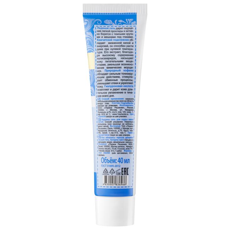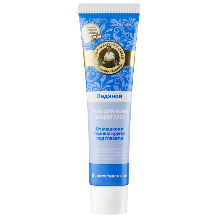 Гель для кожи вокруг глаз Рецепты бабушки Агафьи ледяной дарит ощущение легкой прохлады и активно борется с темными кругами и мешками под глазами. Камчатский подснежник обладает жизненной силой и энергией, он способен расти даже при нулевой температуре. Его экстракт, благодаря высокому содержанию полисахаридов, насыщает кожу питательными веществами, уменьшая возникновение мимических морщинок. Природный кофеин обладает сильным тонизирующим действием, стимулирует обменные процессы, уменьшает отеки и укрепляет кожу. Гиалуроновая кислота осветляет и дарит коже длительное увлажнение в течение всего дня.
