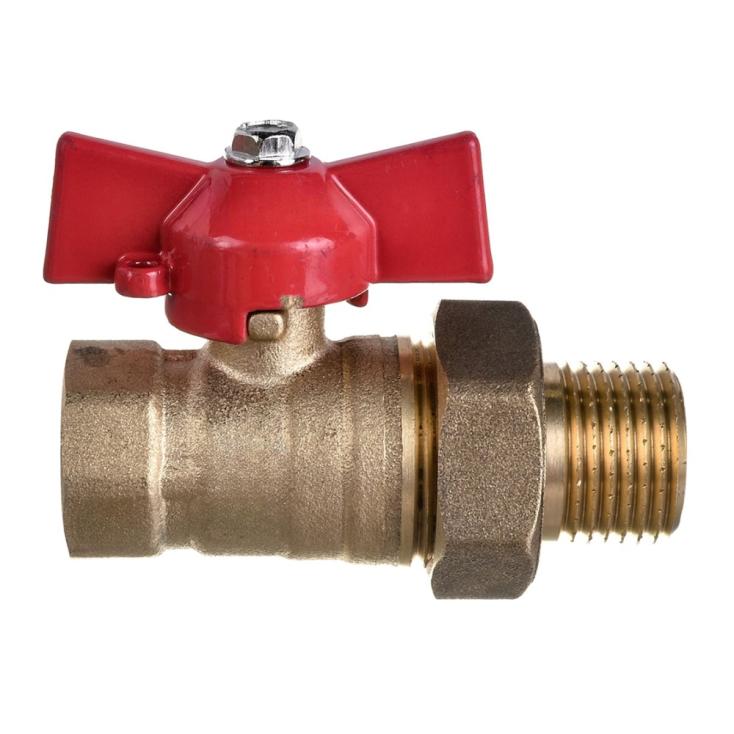 Кран шаровой со сгоном 1/2'' ВР/нак/г бабочка 11Б27п1 SKS Optima 111H69. Разъемное соединение крана с внутренней резьбой "американка" и накладной гайкой, предназначен для установки в качестве запорного устройства на трубопроводах. Рабочая среда вода, пар, жидкие неагрессивные среды. Материал корпуса латунь. Материал шара углеродистая сталь + хром. Материал уплотнения PTFE (фторопласт).