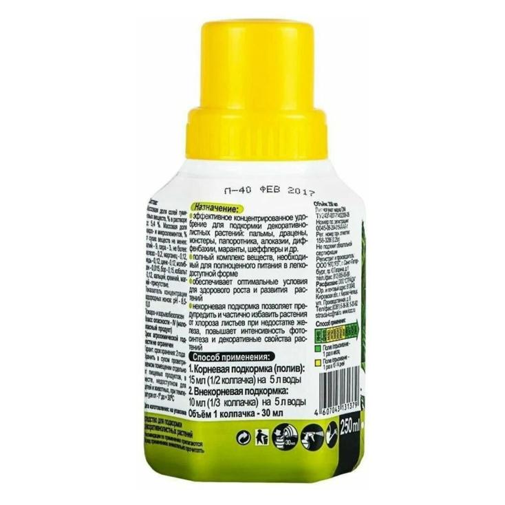 Удобрение для декоративно-листных растений Joy 0,25 л — это специально разработанная подкормка, предназначенная для улучшения роста и декоративных качеств всех видов декоративно-лиственных растений. В его составе сбалансированное количество азота, фосфора и калия, а также микроэлементы, которые способствуют интенсивному росту листвы, улучшению окраски и укреплению растения. Это удобрение помогает растениям развивать крепкую корневую систему, повышает их устойчивость к заболеваниям и улучшает их общий вид. Препарат идеально подходит для таких культур, как фикусы, драцены, спатифиллумы, а также для всех видов растений с декоративной листвой. Упаковка 0,25 л удобна для использования в домашних условиях и на небольших участках. С этим удобрением ваши растения будут не только зелёными, но и крепкими, с красивой и здоровой листвой, которая будет радовать вас в любое время года.