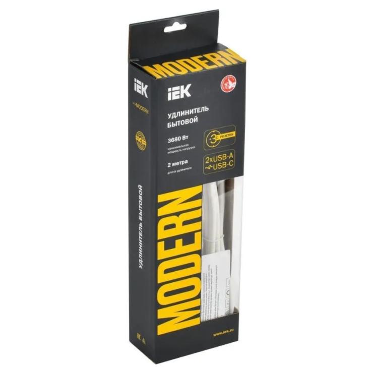 Удлинитель сетевой IEK Modern У03В Пвс 3х1 3 гнездa 2 м 16А c/з 2Type A+1Type C белый