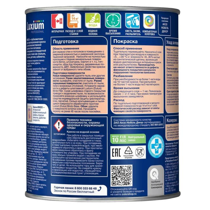 Краска латексная Luxium Prof Bindo 3 BW глубокоматовая белая 1 л — это современное решение для тех, кто ценит безупречное качество отделки и долговечность покрытия. Она создана на основе латексной формулы, которая обеспечивает высокую укрывистость, прочность и устойчивость к воздействию внешних факторов. Глубокоматовый белый цвет позволяет добиться элегантного бархатистого эффекта на стенах и потолках, скрывает мелкие неровности поверхности и придаёт интерьеру гармоничный и стильный вид. Такой оттенок универсален: он прекрасно подходит как для современных минималистичных интерьеров, так и для классических пространств, наполняя их светом и ощущением чистоты. Краска легко наносится валиком, кистью или краскопультом, быстро сохнет и практически не имеет запаха, что делает процесс ремонта комфортным. Объём 1 л удобен для небольших помещений или локальных работ, например, для обновления отдельных стен или элементов декора. Покрытие отличается стойкостью к мытью, поэтому идеально подходит для кухонь, прихожих и комнат с интенсивной эксплуатацией. Благодаря своей структуре краска сохраняет насыщенность белого оттенка долгое время, не желтеет и не тускнеет. Выбирая латексную краску Luxium Prof Bindo 3 BW глубокоматовую белую 1 л, вы получаете профессиональное качество, простоту применения и уверенность в долговечности результата. Создайте интерьер своей мечты с надёжным и стильным покрытием, которое будет радовать вас долгие годы.