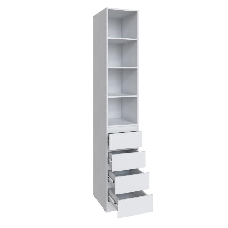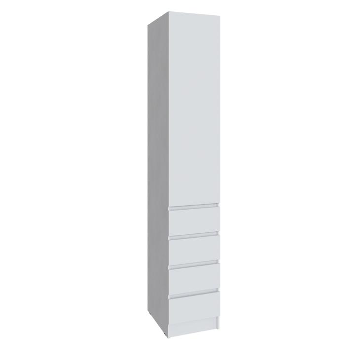 Пенал с 4-мя ящиками Мадрид 400х2300х520 мм Белый — это практичная и изящная мебель для организации хранения в доме. Узкий корпус шириной 400 мм идеально подойдёт для небольших помещений, позволяя максимально эффективно использовать пространство. Высота 2300 мм обеспечивает достаточную вместительность, а глубина 520 мм делает использование удобным и универсальным. Внутреннее наполнение пенала включает полки для одежды и аксессуаров, а также четыре выдвижных ящика в нижней части конструкции, которые помогут хранить бельё, мелочи или текстиль. Белый цвет придаёт мебели лёгкость, визуально расширяет комнату и делает её более светлой. Дизайн модели лаконичен, но современен, что позволяет гармонично вписать её как в классический, так и в минималистичный интерьер. Пенал выполнен из качественных материалов, устойчивых к ежедневным нагрузкам и износу, благодаря чему он прослужит долгие годы. Это универсальный предмет мебели, который отлично сочетается с другими элементами коллекции Мадрид, создавая завершённый и уютный интерьер.