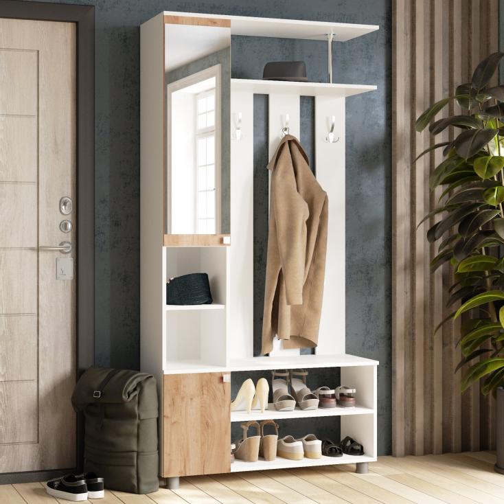 Прихожая 1000х200х370 мм Белый/Дуб крафт золотой — это компактная и функциональная модель, которая идеально подойдёт для небольших прихожих. Благодаря сочетанию белого цвета и древесного декора дуб крафт золотой мебель выглядит стильно, современно и при этом добавляет в интерьер ощущение тепла. Прихожая оборудована полками для обуви, крючками для верхней одежды и местом для хранения аксессуаров, что позволяет удобно организовать пространство. Размеры делают её удобной для установки даже в узких коридорах, сохраняя максимум функциональности. Качественные материалы обеспечивают долговечность и устойчивость к ежедневной эксплуатации. Такая прихожая прекрасно подойдёт для современных квартир, загородных домов или небольших студий. Сделайте свой интерьер удобнее и гармоничнее с прихожей Белый/Дуб крафт золотой — компактным и стильным решением для вашего дома!