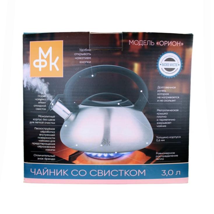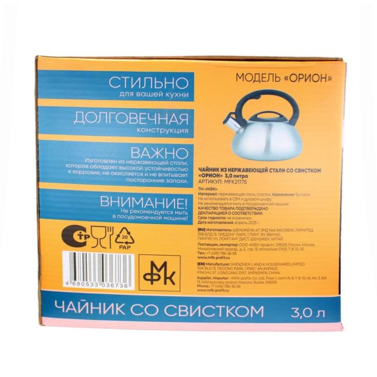 Чайник со свистком нержавеющая сталь Орион 3 л MFK21175 — это надёжный и стильный помощник для вашей кухни, созданный для тех, кто ценит комфорт и долговечность в повседневных мелочах. Вместительный объём 3 литра позволяет быстро вскипятить воду для всей семьи или большой компании, что особенно удобно во время завтраков, обедов и праздничных встреч. Изготовленный из высококачественной нержавеющей стали, чайник отличается прочностью, устойчивостью к коррозии и сохранением блеска на долгие годы. Материал не впитывает запахов, не изменяет вкус воды и гарантирует абсолютную безопасность при использовании. Широкое дно способствует равномерному нагреву, экономии времени и энергии, а современная конструкция делает процесс кипячения быстрым и эффективным. Встроенный свисток вовремя оповестит о закипании воды, защищая от выкипания и сохраняя безопасность на кухне. Эргономичная ручка удобна для захвата, устойчива к нагреву и позволяет легко наливать кипяток, не опасаясь ожога. Лаконичный дизайн в стиле «Орион» с металлическим блеском органично впишется в любой интерьер кухни, будь то классика или современный минимализм. Чайник со свистком нержавеющая сталь Орион 3 л MFK21175 прост в уходе: его поверхность легко очищается и сохраняет первозданный вид даже при частом использовании. Это сочетание вместимости, практичности и стиля делает чайник незаменимым аксессуаром для каждой семьи. Добавьте на вашу кухню надёжность и элегантность — выберите Чайник со свистком нержавеющая сталь Орион 3 л MFK21175 и наслаждайтесь уютом с каждой чашкой чая или кофе!