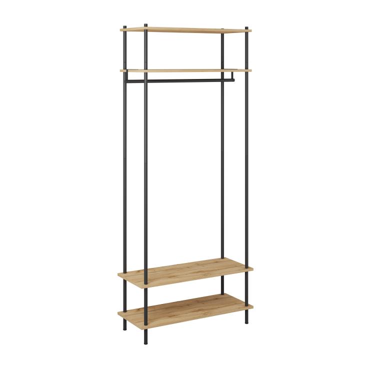 Прихожая НеШкаф 34 825х2065х366 мм Черный — это современное и практичное решение для организации пространства в доме или квартире. Конструкция отличается компактными размерами, что позволяет установить её даже в узких коридорах, при этом она остаётся максимально функциональной. Высота 2065 мм обеспечивает вместительность: на верхней перекладине можно разместить верхнюю одежду, пиджаки или куртки, на полках — сумки, обувь и аксессуары. Чёрный цвет придаёт модели стильный и солидный вид, гармонично сочетающийся с современными интерьерами в стиле лофт, модерн или минимализм. Прочный каркас обеспечивает устойчивость и долговечность, а продуманная конструкция помогает поддерживать порядок в прихожей. Эта модель станет удобным местом для хранения вещей и одновременно акцентным элементом интерьера. Прихожая НеШкаф 34 в чёрном цвете — выбор тех, кто ценит функциональность, практичность и современный дизайн.
