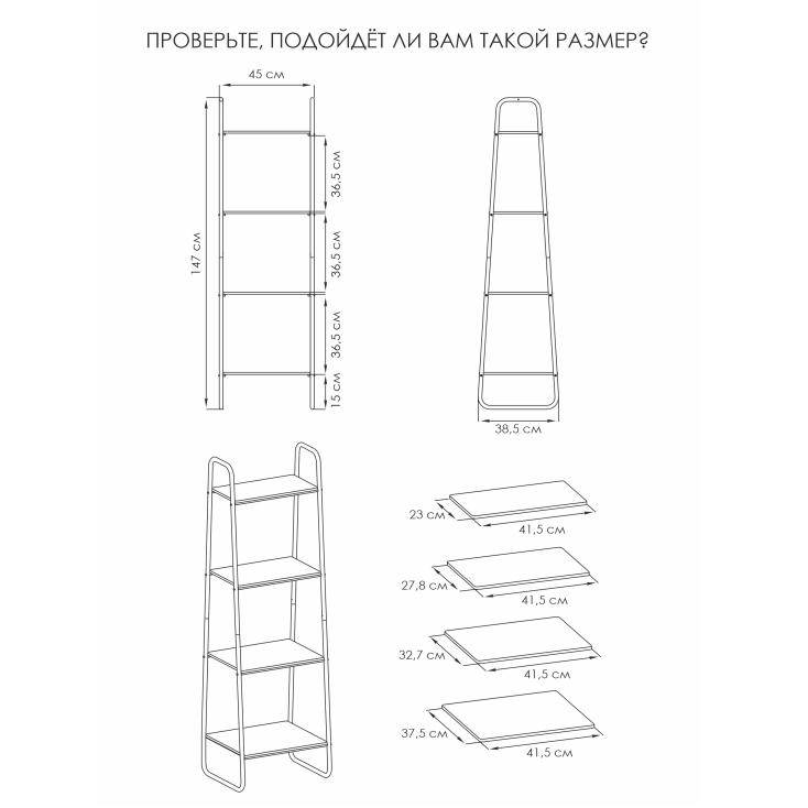 КомплектацияПолка D 375х415 мм - 1 шт; Полка C 327х415 мм - 1 шт; Полка B 278х415 мм - 1 шт; Полка А 230х415; Стойка нижняя - 2 шт; Стойка верхняя - 2 шт; Трубка под полку 418 мм - 8 шт; Фурнитура - 1 пакет