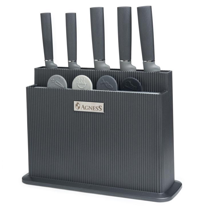 Набор ножей Agness 10 предметов 5 ножей, 4 доски и подставка, цвет черно-серый