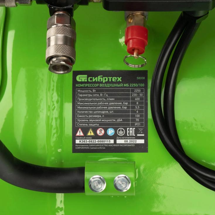 Компрессор безмаслянный малошумный Сибртех МБ 2250/100 100 л 400 л/мин 2,25кВт
