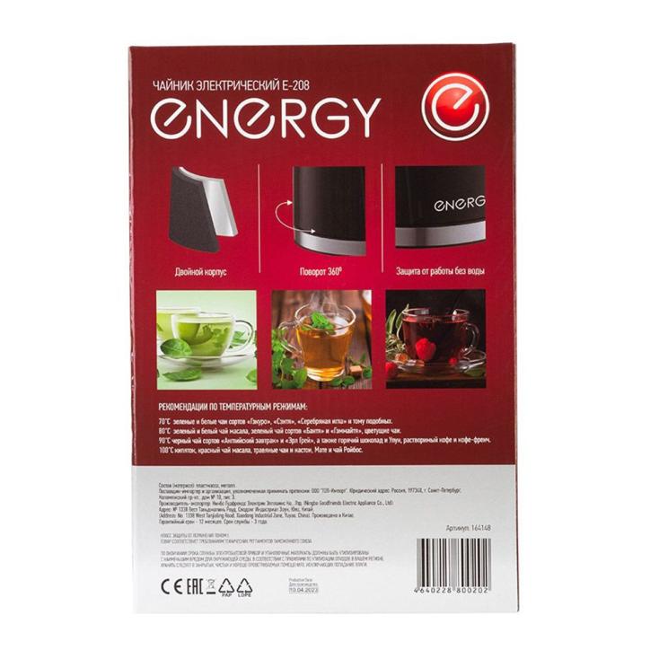 Стильный и надёжный чайник электрический Energy E-208 2200 Вт 1,7 л белый сочетает современный дизайн, функциональность и высокую производительность. Благодаря мощности 2200 Вт он быстро доводит воду до кипения, экономя ваше время, а объём 1,7 литра позволяет приготовить напиток сразу для всей семьи. Корпус выполнен из прочного термостойкого пластика белого цвета, который не нагревается снаружи и сохраняет эстетичный вид даже при длительном использовании. Встроенный световой индикатор работы сообщает о включении прибора, а автоматическое отключение при закипании обеспечивает полную безопасность. Нагревательный элемент закрытого типа из нержавеющей стали защищён от накипи и продлевает срок службы устройства. Удобная ручка с противоскользящим покрытием и широкое горлышко делают налив и очистку максимально комфортными. Поворотная база на 360° упрощает установку чайника в любом положении. Energy E-208 белый — это сочетание скорости, практичности и современного дизайна, создающее комфорт на вашей кухне.