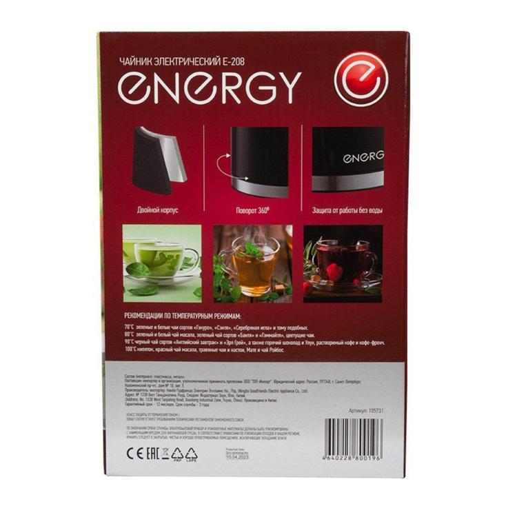 Элегантный чайник электрический Energy E-208 2200 Вт 1,7 л черный станет функциональным и стильным элементом вашей кухни. Мощность 2200 Вт обеспечивает быстрое закипание воды, а вместимость 1,7 л делает его удобным для семьи или офиса. Корпус из прочного термостойкого пластика в благородном чёрном цвете устойчив к нагреву, не выгорает и легко очищается. Закрытый нагревательный элемент из нержавеющей стали гарантирует долговечность и защиту от образования накипи. Функция автоматического отключения при закипании и защита от включения без воды делают эксплуатацию полностью безопасной. Световой индикатор подсказывает момент работы прибора, а поворотная база на 360° обеспечивает удобство использования. Эргономичная ручка и широкое горлышко позволяют легко наливать воду и очищать внутреннюю колбу. Компактный, лёгкий и практичный, Energy E-208 черный сочетает стиль, мощность и надёжность, обеспечивая комфортное чаепитие каждый день.